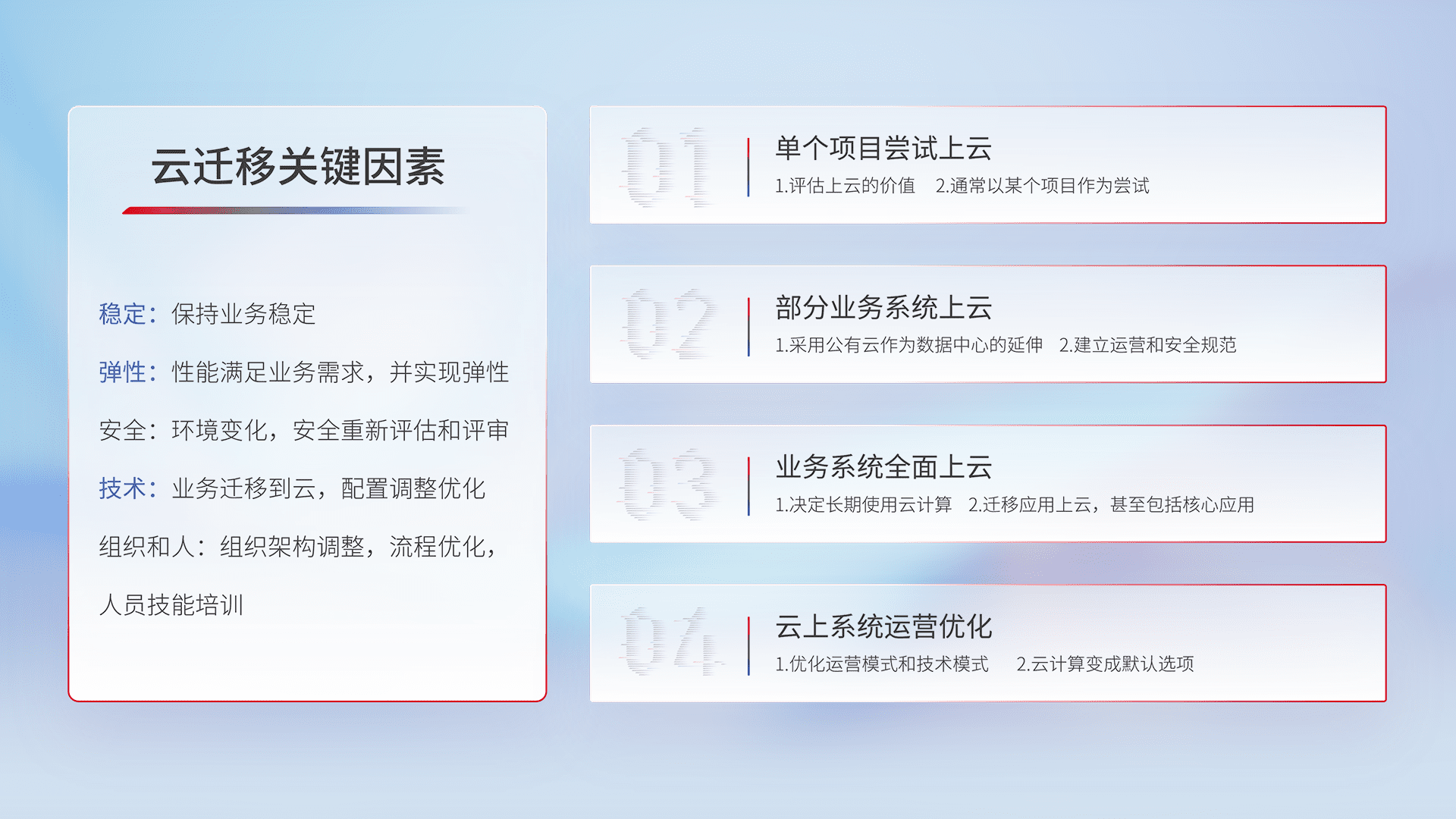 结合实际业务,,从规划设计、、云平台选型、、、、云原生改造、、、数据迁移、、集成交付,,,迁移全过程为客户识别最佳上云路径,,,做好风险识别管理,,设计网络架构、、、身份权限、、、安全审计合规、、、操作审计、、日志审计、、监控告警策略、、、、多站点容灾设计等,,,,对云上基础设施进行整体规划,,,,提升IT治理水平,,,以满足弹性、、、、高可用、、高性能的需求。。