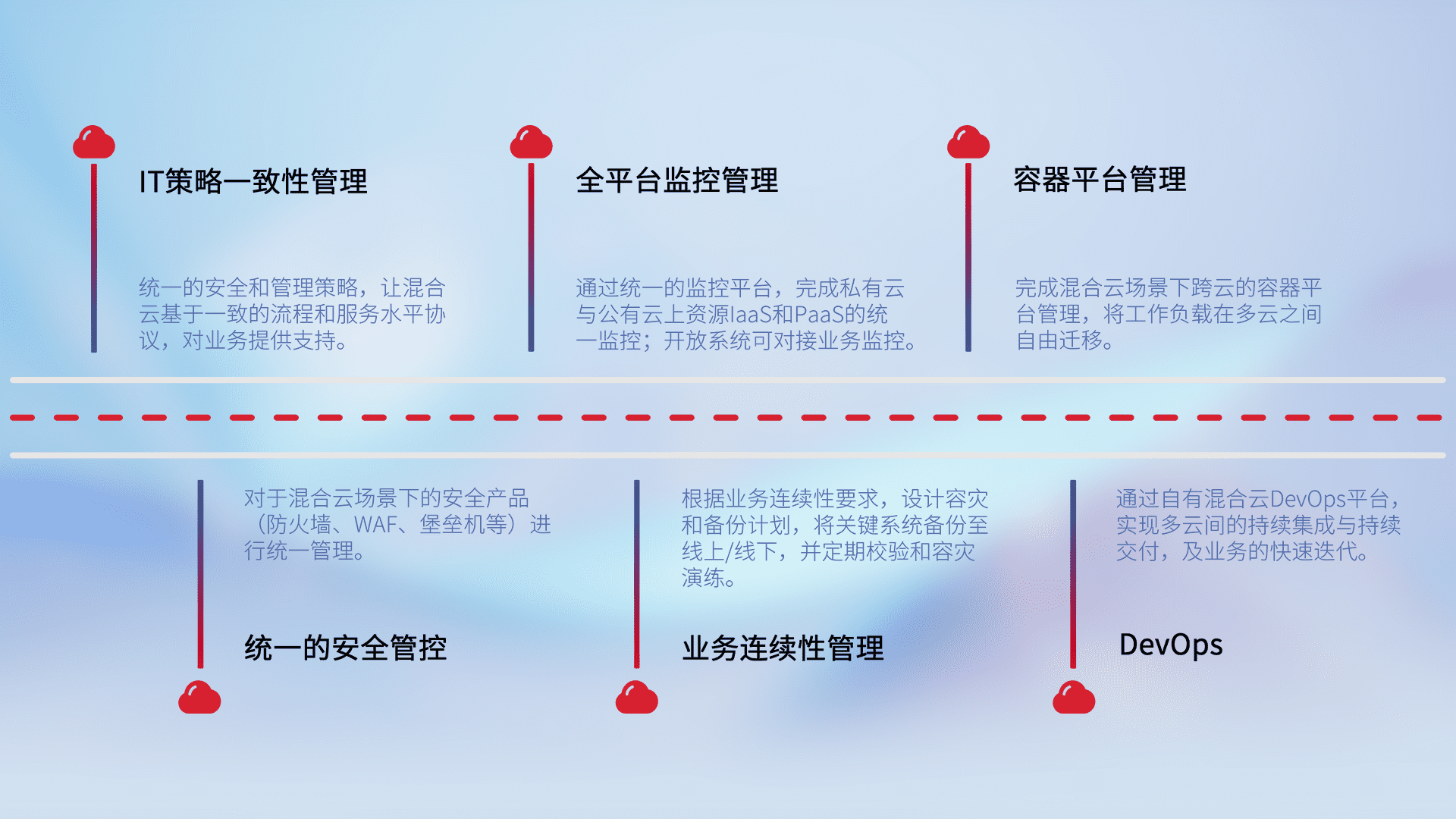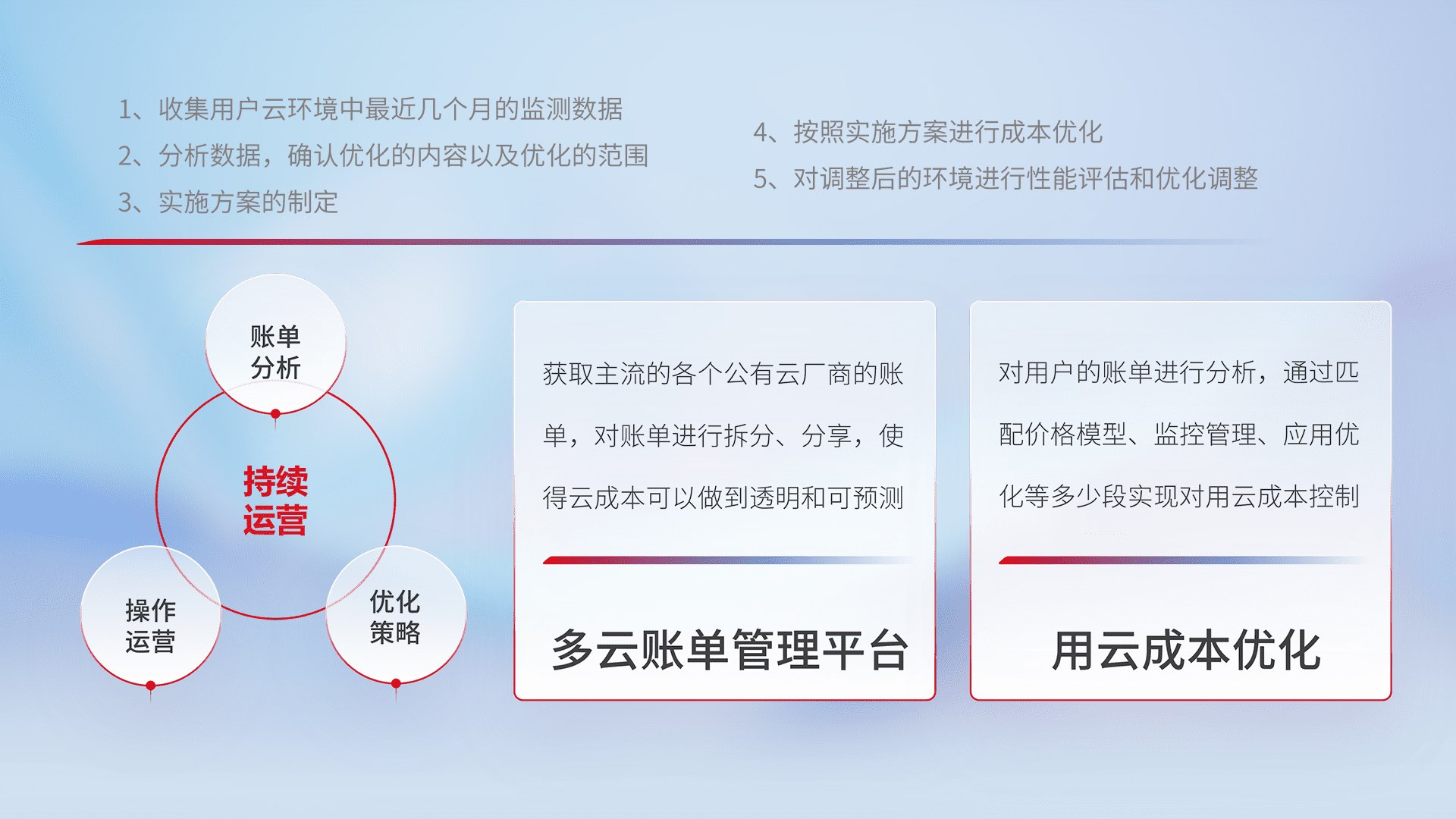 通过多云纳管,,以统一的资源数据模型把客户的云资源进行抽象和封装,,进而实现对多云资源的统一操作,,保障云资源管理的可靠性、、、稳定性与可用性。。。。量身定制化运维内容,,,配置、、、、开发运维、、补丁管理、、备份、、、、监控、、、、认证和访问管理、、、、审计和日常巡检等,,,保障在用云过程中的可靠度,,,,稳定度以及高可用率。。。